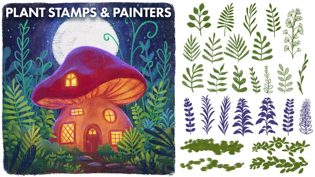 The set comes with a variety of dry and wet media brushes including pencils, pastels, crayons, watercolor and gouache. It also has a large selection of traditionally hand-drawn convenience brushes to speed up the process of repetitive textures such as cross-hatching, scribbles, squiggles and other fun patterns. You’ll also find a wide variety of stylized brushes for foliage and environment illustrations.