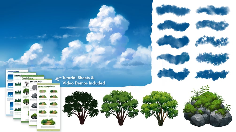 In this pdf guide, I share my step-by step process for painting subjects such as clouds, rocks, grassy paths and trees from start to finish. The guides contain explanations for each step and information on which brushes were used throughout the process.