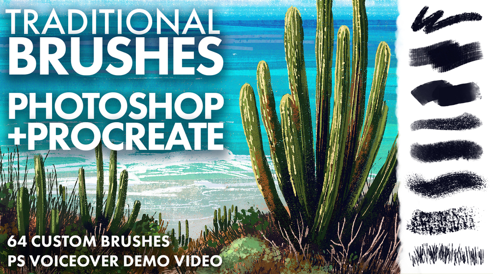 (64) Traditional Texture Brushes for Photoshop and Procreate for personal and commercial use. (2) 1hr+demo videos (3)Hi-Res artwork files